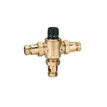 Regulowany termostatyczny zawór mieszający z zaworami zwrotnymi, filtrami na wlotach i złączkami zaciskowymi O 15 30-65 st. C