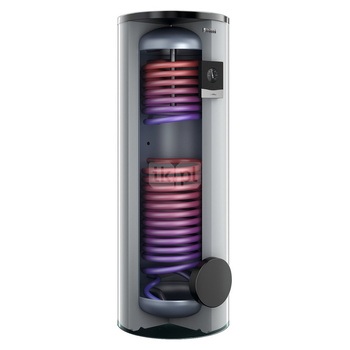 VIH S2 350/4B, stojący okrągły o pojemności 350litrów, wyposażony w dwie wężownice do pracyw układach solarnych z grupami pomp