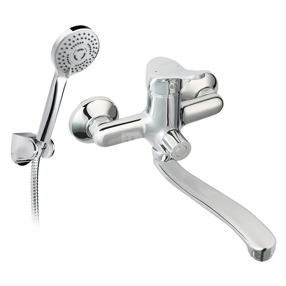 Bateria umywalkowo-wannowa ścienna z przyłączem natrysku, chrom: