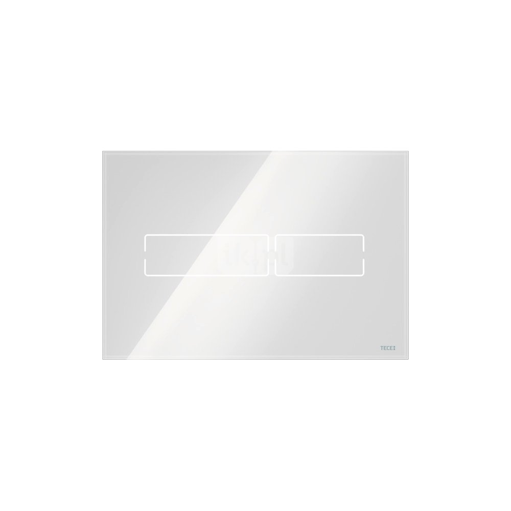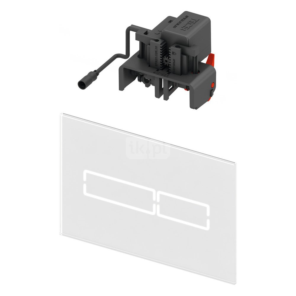 Mechanizm spłukujący elektroniczny do bezdotykowego uruchamiania standardowych spłuczek TECE (głębokość montażowa 13 cm), uruchamianych z przodu, z mechanizmem na wysokości ok. 1 M (środek płytki). Płaska płytka uruchamiająca ze szkła z podwójnym elektrycznym mechanizmem spłukującym. Do montażu natynkowego lub zlicowanego. Kompatybilny z płytką maskującą z koszem na kostki czyszczące.