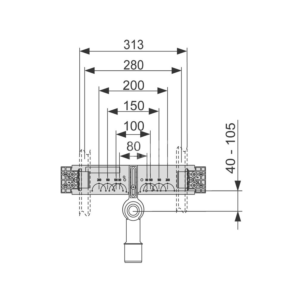 Trawers ze stali ocynkowanej z izolacją akustyczną, do montażu kolan naściennych, z zamontowanym kolankiem przyłączeniowym DN 40/50, redukcją gumową 30/50, zatyczką ochronną, materiałami mocującymi do montażu na kształtownikach TECEprofil, 2 x zaciski mocujące M 10 i mocowania umywalkowe.