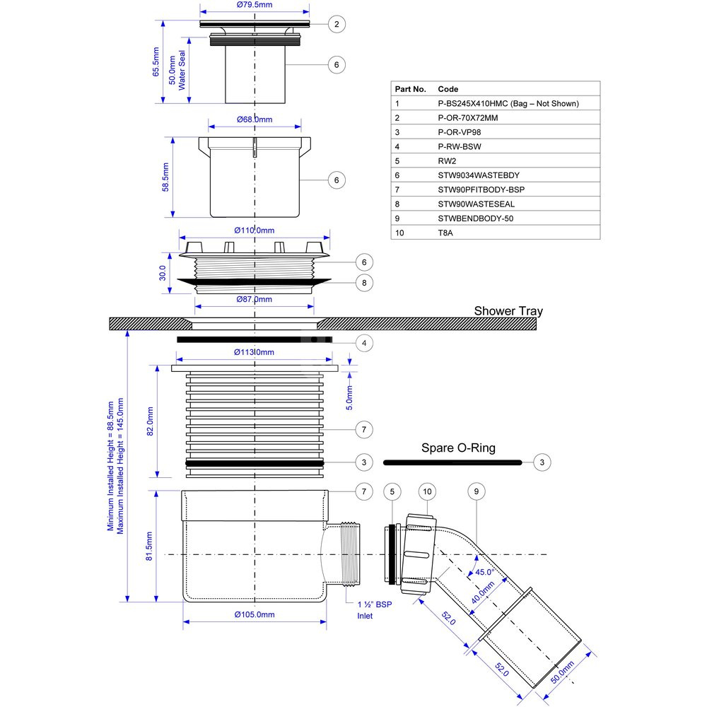 Syfon odpływowy do odpływów liniowych z regulowaną wysokością w zakresie 88,5 >145