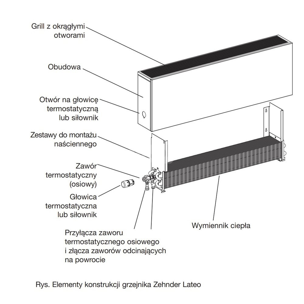 Konwektor z płaskim frontem, montaż naścienny, zamaskowane przyłącza