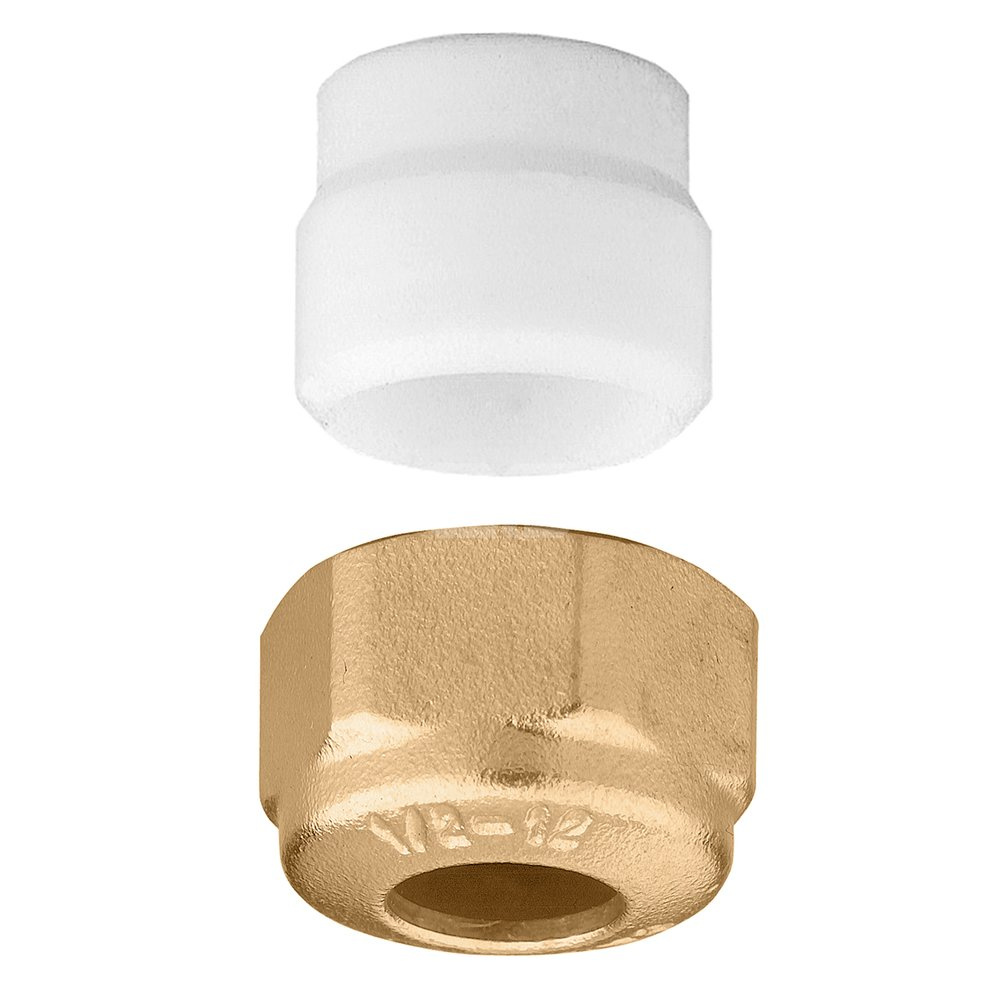Nakrętka i nakrętka pierścieniowa lub uszczelka z pojedynczym rowkiem do PTFE. Do rury miedzianej 1/2" + pierścień z rowkiem O 1