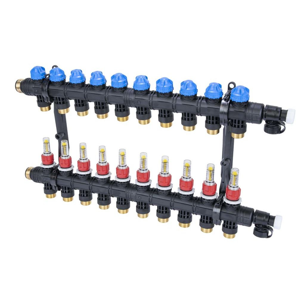 Urządzenie przeznaczone jest do obsługi 10 obiegów grzewczych. Kompletny rozdzielacz składa się z belek zasilającej i powrotnej oraz wieszaków ściennych. Belka zasilająca wyposażona jest w rotametry do regulacji przepływu. Belka powrotna wyposażona jest w zawory do ręcznego zamykania obiegów lub montażu siłowników termoelektrycznych. Obie belki zakończone są zaworami do odpowietrzania, opróżniania, napełniania i płukania instalacji. Do zaworów można podłączyć przyłącza do węża elastycznego. Już posiadany rozdzielacz ProCalida można rozbudować o dowolną ilość sekcji (dzięki rozszerzeniom) oraz o bajpas z zaworem upustowym różnicy ciśnień.