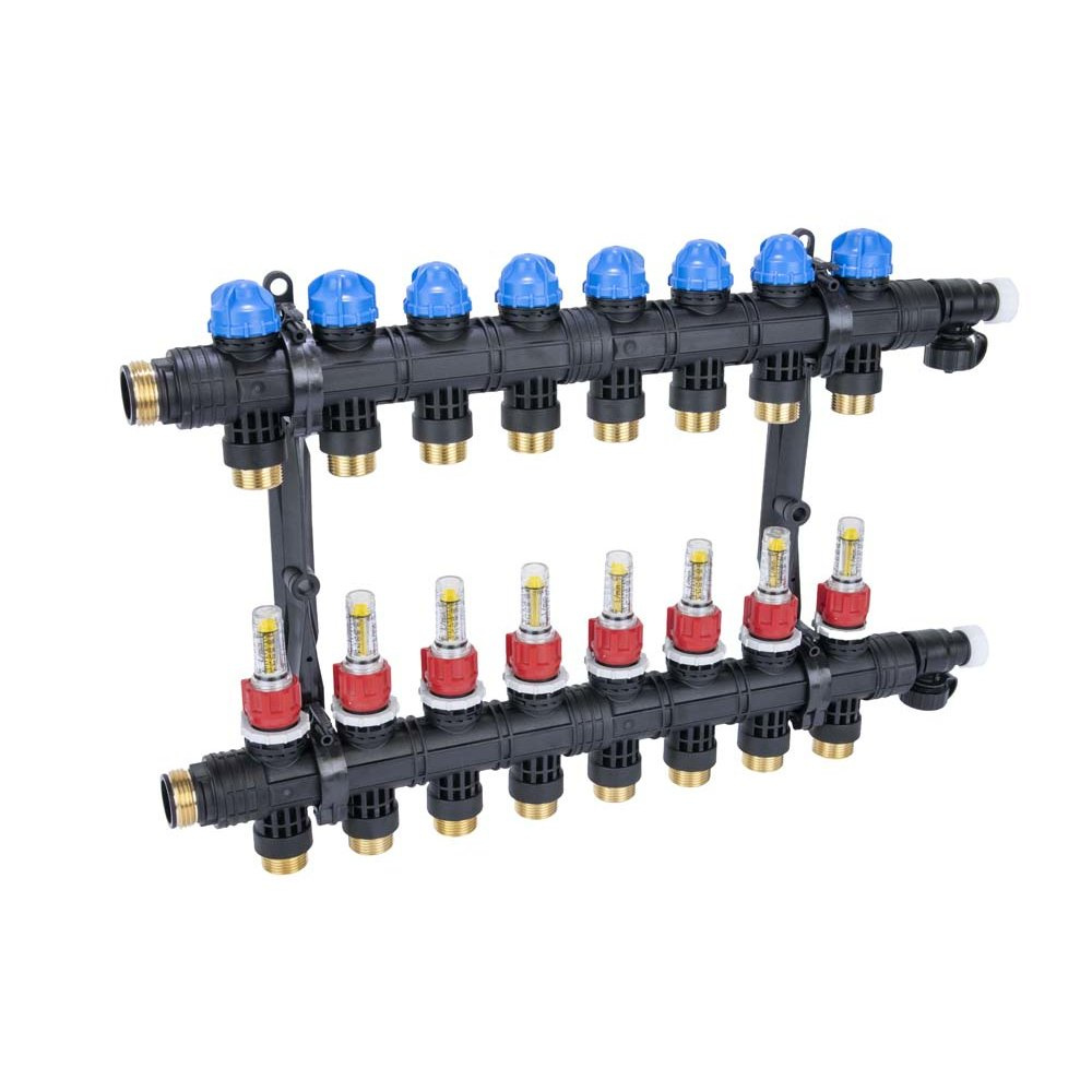 Urządzenie przeznaczone jest do obsługi 8 obiegów grzewczych. Kompletny rozdzielacz składa się z belek zasilającej i powrotnej oraz wieszaków ściennych. Belka zasilająca wyposażona jest w rotametry do regulacji przepływu. Belka powrotna wyposażona jest w zawory do ręcznego zamykania obiegów lub montażu siłowników termoelektrycznych. Obie belki zakończone są zaworami do odpowietrzania, opróżniania, napełniania i płukania instalacji. Do zaworów można podłączyć przyłącza do węża elastycznego. Już posiadany rozdzielacz ProCalida można rozbudować o dowolną ilość sekcji (dzięki rozszerzeniom) oraz o bajpas z zaworem upustowym różnicy ciśnień.