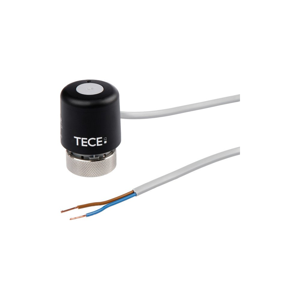 Siłownik termoelektryczny w stanie bezprądowym zamknięty (NC), do montażu na zaworach powrotnych obwodów rozdzielacza ogrzewania podłogowego SLQ, stopień ochrony IP 54, przez co może być zamontowany w każdym położeniu 360°. Śrubunek z niklowanego mosiądzu M 30 x 1,5 dopasowany do rozdzielaczy ogrzewania podłogowego firmy TECE pod względem wielkości skoku roboczego, optymalna siła zamykania 80 N, zasilanie 24 V/230 V.