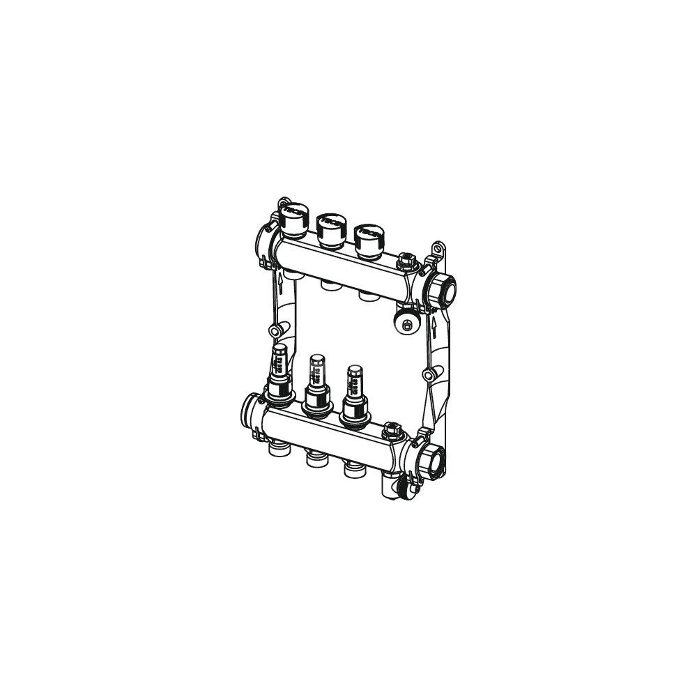 Rozdzielacz ogrzewania podłogowego ze stali nierdzewnej. Belka rozdzielacza obwodów grzewczych o dużym przekroju wewnętrznym komory, powierzchnia polerowana, dźwiękochłonne uchwyty wykonane z tworzywa do szybkiego montażu z półśrubunkiem 1" i płaską uszczelką. Zintegrowane wkładki zaworowe powrotne z podwójnym uszczelnieniem typu O-ring na popychaczu zaworu, grzybek zaworu z o-ringiem dla bezpiecznego zamykania obwodów ogrzewania, przepływomierze z zakresem regulacji 0,5-4 l/min z blokadą oraz możliwością odcięcia przepływu zgodne z normą PN-EN 1264-4.