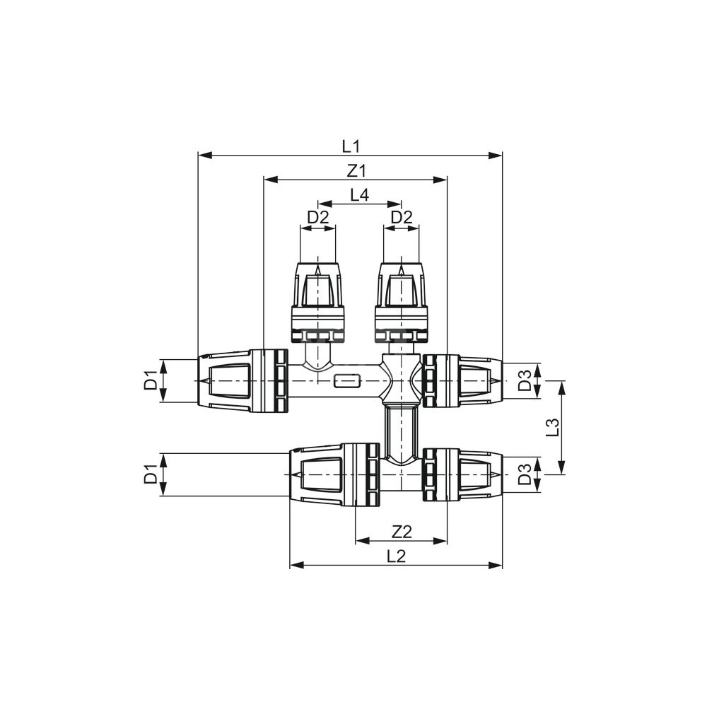 Trójnik krzyżakowy z połączeniem wtykowym. Do instalacji grzewczych.