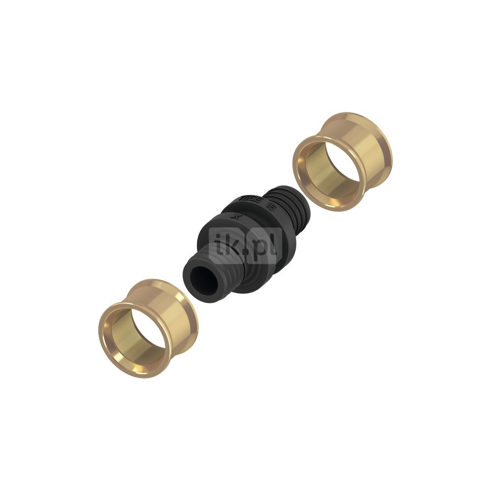 Zestaw składający się ze złączki prostej z PPSU i specjalnie dopasowanych tulei zaciskowych.