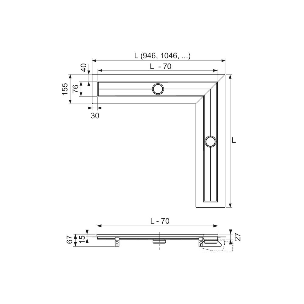 Korpus rynny w wykonaniu kątowym 90° do montażu w jastrychu, z kołnierzem i taśmą uszczelniającą Seal System, co umożliwia wykonanie trwałego i bezpiecznego uszczelnienia przeciwwilgociowego w połączeniu z izolacją posadzki.