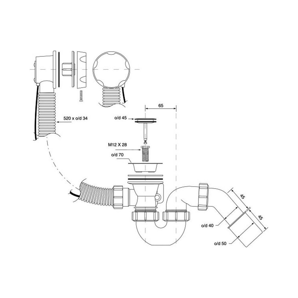 Zestaw odpływowo-przelewowy do wanny i głębokiego brodzika z pokrętłem i korkiem umożliwiającym zamknięcie i otwarcie odpływu. Pokrętło wykonane z mosiądzu pokrytego warstwą chromu. Odejście 11/2"x40/50mm.