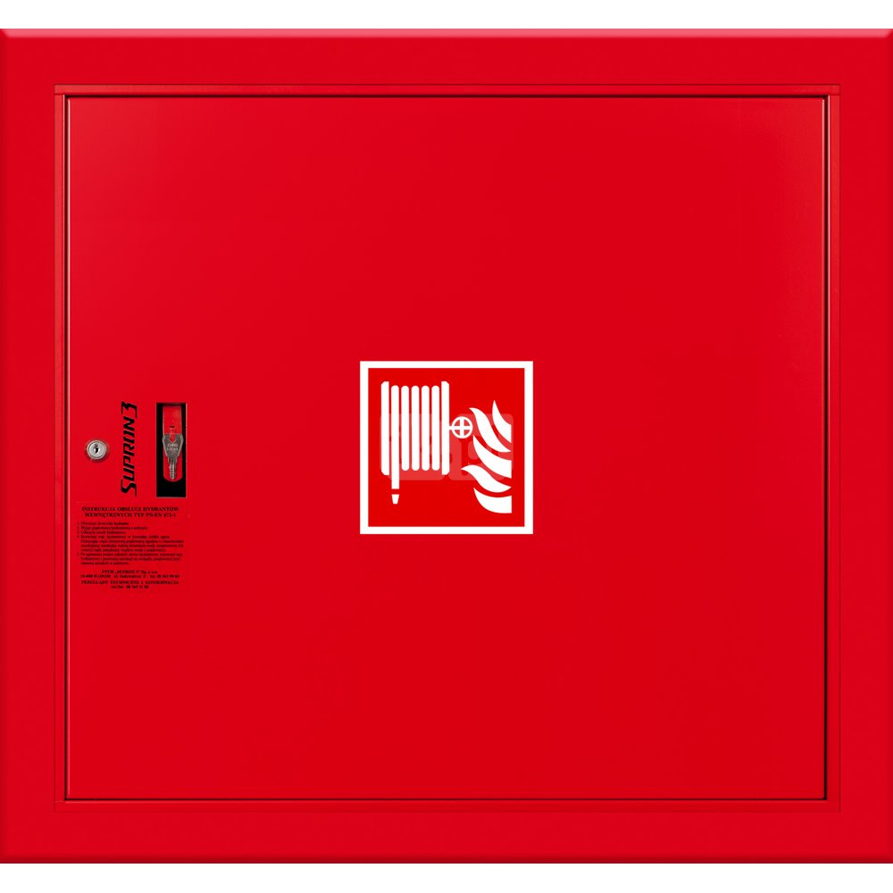 - szafka hydrantowa STANDARD wykonana z blachy czarnej malowanej farbą proszkową poliestrową fasadową typ Facade w kolorze czerwonym (RAL 3000) lub białym (RAL 9003), drzwi pełne; dzięki zastosowaniu zawiasu krytego drzwi szafki można otworzyć o 180°