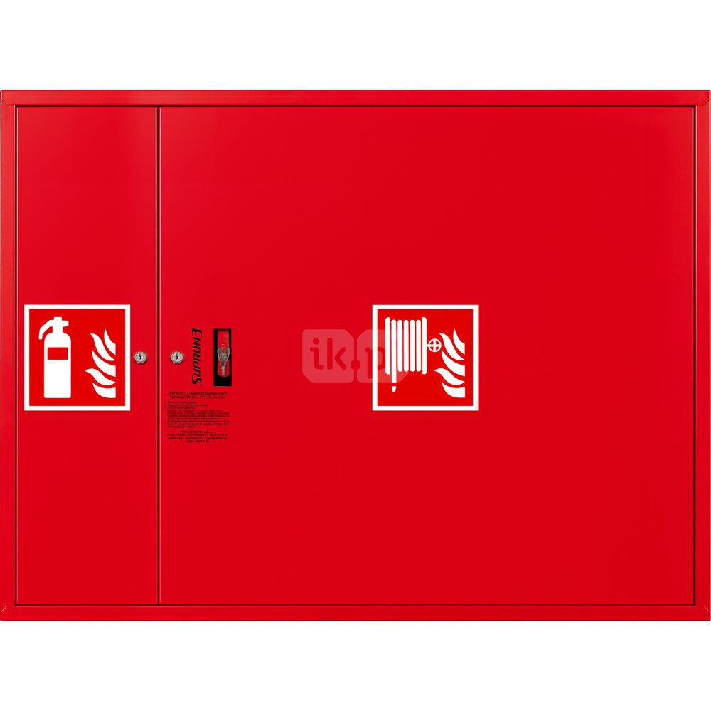 - szafka hydrantowa STANDARD wykonana z blachy czarnej malowanej farbą proszkową poliestrową fasadową typ Facade w kolorze czerwonym (RAL 3000) lub białym (RAL 9003), drzwi pełne; dzięki zastosowaniu zawiasu krytego drzwi szafki można otworzyć o 180°