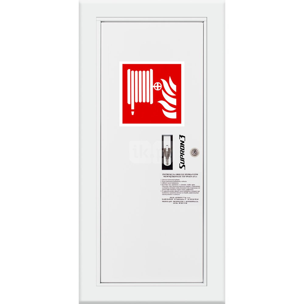 - szafka hydrantowa STANDARD wykonana z blachy czarnej malowanej farbą proszkową poliestrową fasadową typ Facade w kolorze czerwonym (RAL 3000) lub białym (RAL 9003), drzwi pełne; dzięki zastosowaniu zawiasu krytego drzwi szafki można otworzyć o 180°