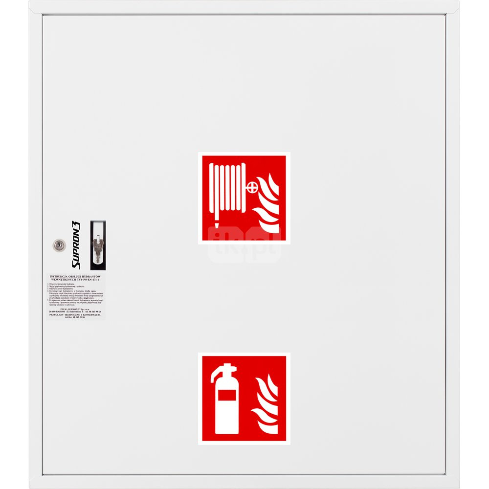 - szafka hydrantowa STANDARD wykonana z blachy czarnej malowanej farbą proszkową poliestrową fasadową typ Facade w kolorze czerwonym (RAL 3000) lub białym (RAL 9003), drzwi pełne; dzięki zastosowaniu zawiasu krytego drzwi szafki można otworzyć o 180°