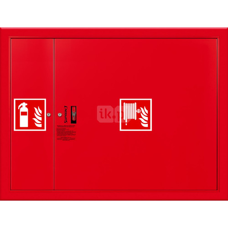 Hydrant DN33 wnękowy z miejscem na gaśnicę obok zwijadła, wąż 20m, ocynk fasada, zamek patent, RAL 3000