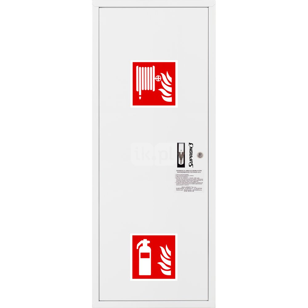 • szafka hydrantowa OCYNKOWANA wykonana z blachy stalowej ocynkowanej elektrolitycznie malowanej farbą proszkową poliestrową fasadową typu Facade w kolorze czerwonym (RAL 3000) lub białym (RAL 9003), drzwi pełne; dzięki zastosowaniu zawiasu krytego drzwi szafki można otworzyć o 180°