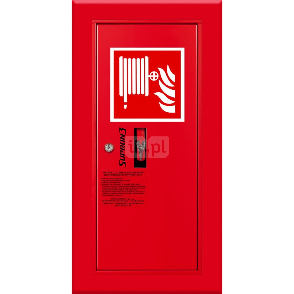- szafka hydrantowa STANDARD wykonana z blachy czarnej malowanej farbą proszkową poliestrową fasadową typ Facade w kolorze czerwonym (RAL 3000) lub białym (RAL 9003), drzwi pełne; drzwi szafki można otworzyć o 180°