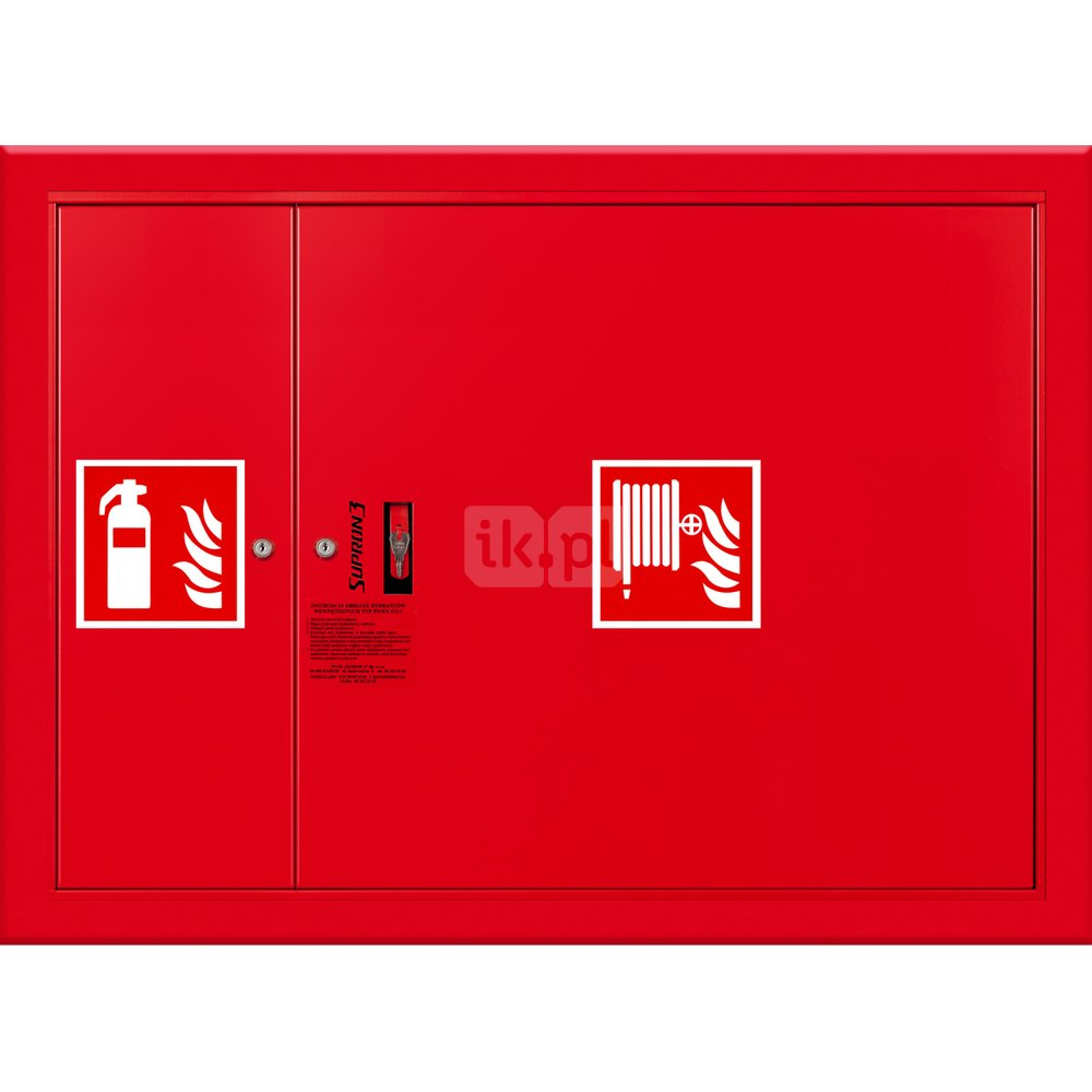 - szafka hydrantowa STANDARD wykonana z blachy czarnej malowanej farbą proszkową poliestrową fasadową typ Facade w kolorze czerwonym (RAL 3000) lub białym (RAL 9003), drzwi pełne; drzwi szafki można otworzyć o 180°
