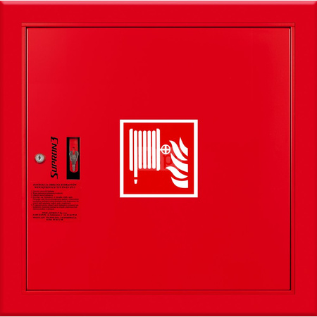 - szafka hydrantowa STANDARD wykonana z blachy czarnej malowanej farbą proszkową poliestrową fasadową typ Facade w kolorze czerwonym (RAL 3000) lub białym (RAL 9003), drzwi pełne; drzwi szafki można otworzyć o 180°