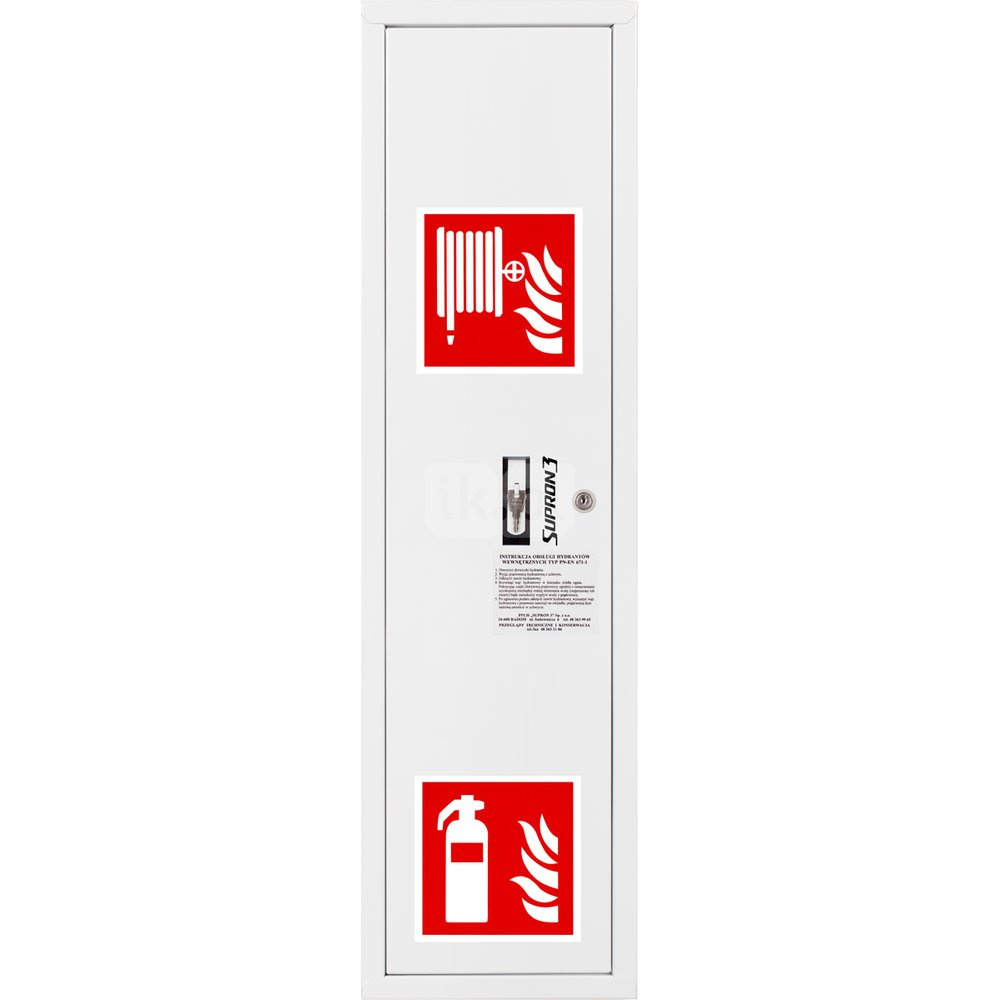 Hydrant DN52 zawieszany boczny ze zwijadłem, z miejscem na gaśnicę, wąż 15m, zamek patent, RAL 9003 lewy