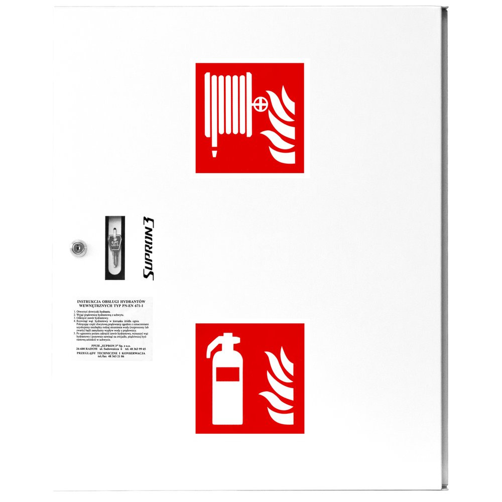 Hydrant DN52 zawieszany z koszem, 600x500x200mm, z miejscem na gaśnicę, wąż 15m, zamek patent, RAL 9003