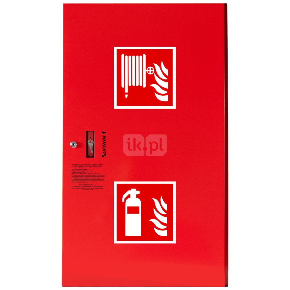 Hydrant DN52 zawieszany z koszem, 850x500x200mm, z miejscem na gaśnicę, wąż 2x15m, zamek patent, RAL 3000