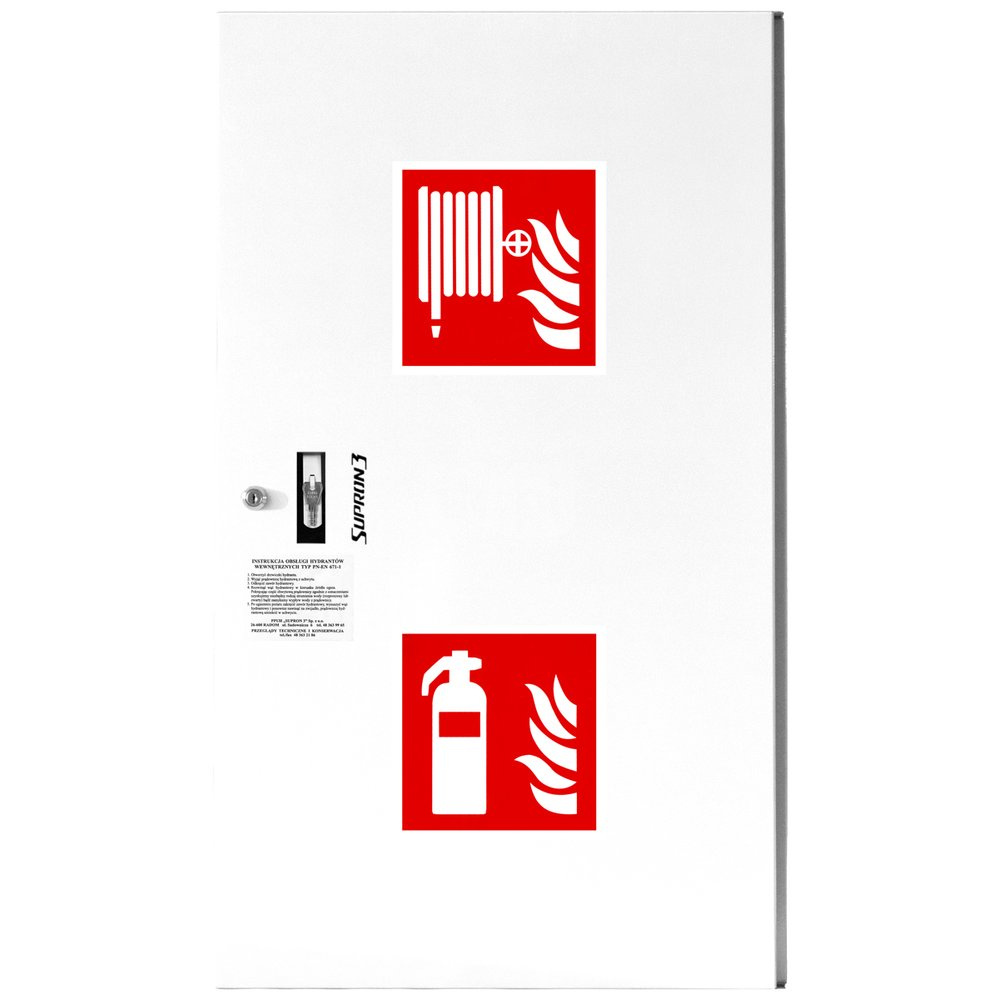 Hydrant DN52 zawieszany z koszem, 850x500x200mm, z miejscem na gaśnicę, wąż 2x15m, zamek patent, RAL 9003