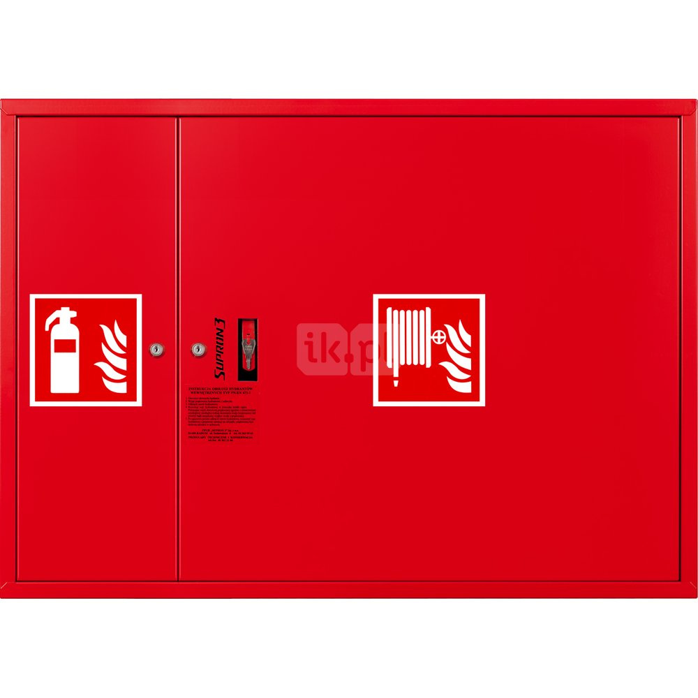 - szafka hydrantowa STANDARD wykonana z blachy czarnej malowanej farbą proszkową poliestrową fasadową typ Facade w kolorze czerwonym (RAL 3000) lub białym (RAL 9003), drzwi pełne; drzwi szafki można otworzyć o 180°