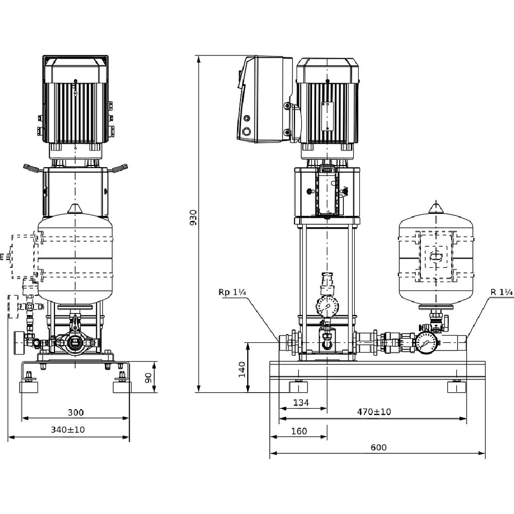 *Montaż na ocynkowanej ramie głównej z amortyzatorami drgań o regulowanej wysokości, z ciśnieniowym naczyniem przeponowym (pojemność 8 l) z armaturą przelotową zgodnie z DIN 4807 i zabudowanym zaworem zwrotnym, czujniki ciśnienia (4 - 20 mA) i manometr do automatycznej regulacji systemu przy funkcji p = stała lub p=zmienna. Wartość zadana wysokości podnoszenia - nastawa bezstopniowo przyciskiem na przetwornicy częstotliwości. Automatyczne rozpoznanie ilości zerowych i wyłączenie. Zabudowane zabezpieczenie silnika poprzez elektroniczną kontrolę wartości prądu.