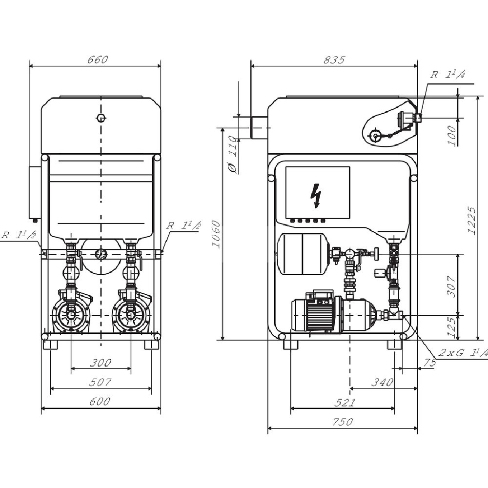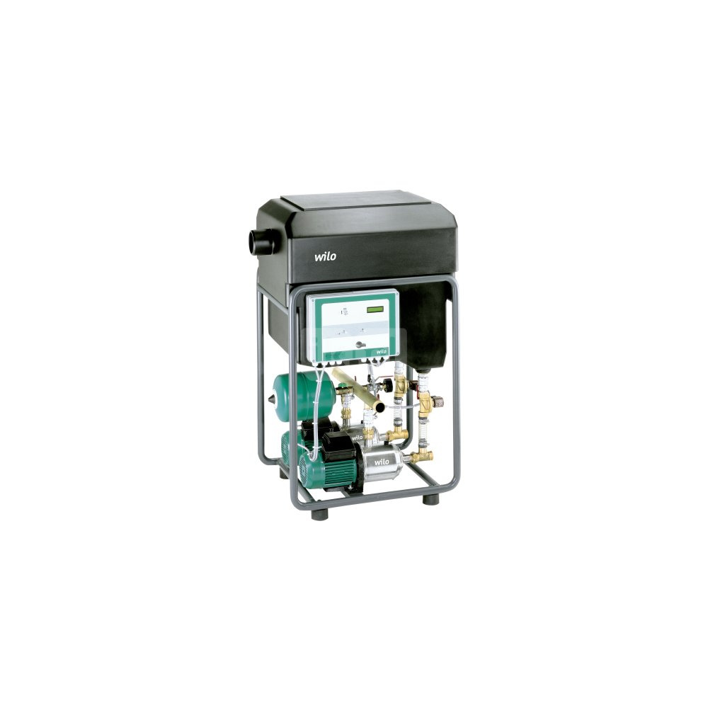 Automatyczna instalacja zasilania deszczówką i świeżą wodą jako kompaktowy moduł przeznaczony do domów wielorodzinnych i budynków użyteczności publicznej, składające się z dwóch cichobieżnych, samozasysających, wielostopniowych, poziomych, wysokociśnieniowych pomp wirowych z nowoczesnym, hydraulicznym systemem zasysania. Zawór kulowy odcinający po stronie ssawnej i tłocznej do każdej pompy z orurowaniem zbiorczym po stronie ssawnej. Dodatkowy zbiornik wody uzupełniającej (150 l) z dostosowanym do zapotrzebowania, dodatkowym napełnianiem świeżą wodą niepełnej cysterny. Przepływowe, ciśnieniowe naczynie przeponowe (8 l) zgodnie z DIN 4807 do oszczędzania energii w przypadku niewielkich wycieków w budynku. Wszystkie części mające kontakt z medium są odporne na korozję.
