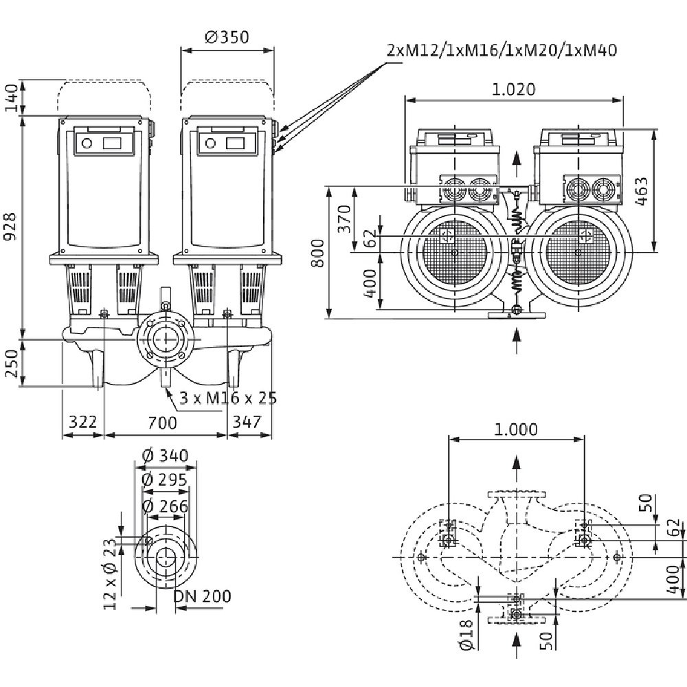 Dławnicowa pompa podwójna o konstrukcji Inline do montażu na rurociągu lub do ustawienia na fundamencie z wbudowaną przetwornicą częstotliwości do regulacji elektronicznej m.in. wg stałej i zmiennej różnicy ciśnień (Δp-c/Δp-v)