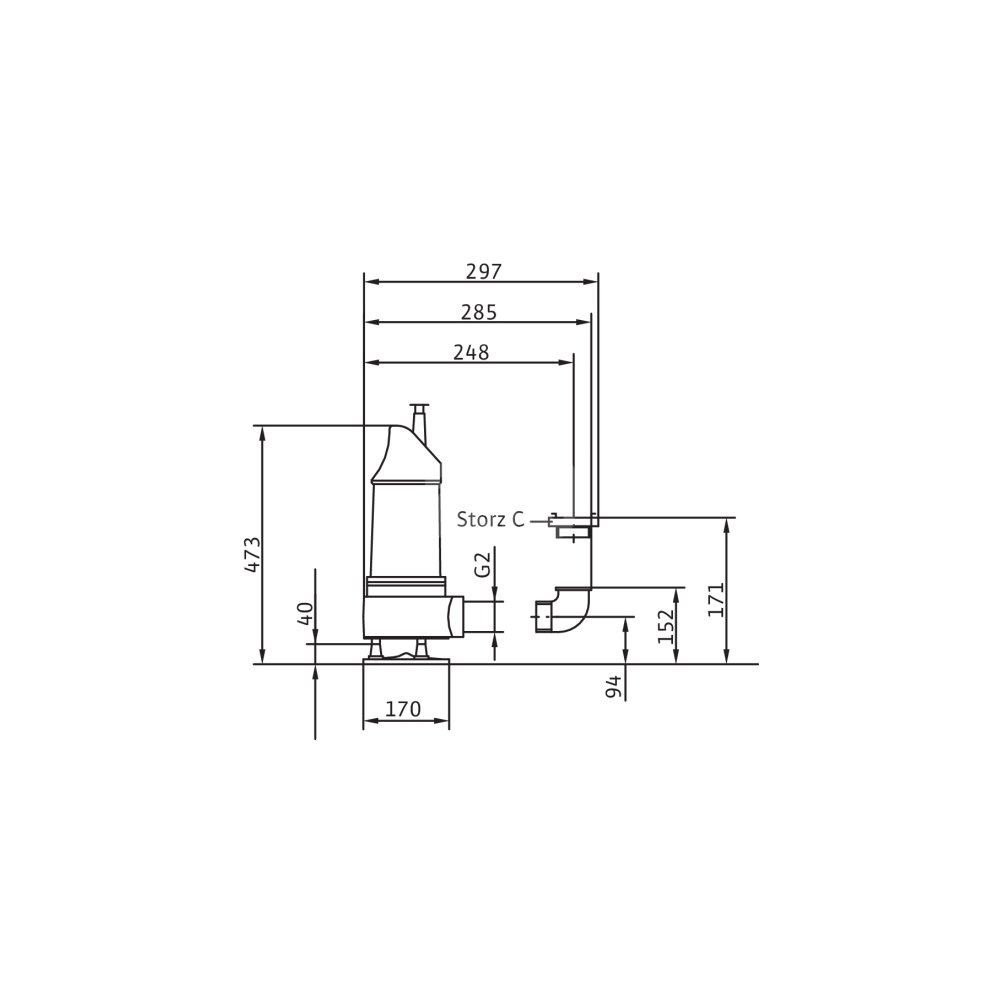Całkowicie zanurzona pompa zatapialna do wody zanieczyszczonej, pionowe ustawienie mokre, do tłoczenia wody zanieczyszczonej i zawierającej piasek Korpus hydrauliczny i wirnik z żeliwa szarego, korpus silnika z aluminium. Przyłącze tłoczne z pionowym odpływem ciśnieniowym i złączem typu Storz. Samochłodzący silnik w wersji na prąd zmienny jednofazowy, z odłączanym kablem zasilającym i wyłącznikiem pływakowym z wtyczką z uziemieniem i kondensatorem roboczym. Do uszczelnienia po stronie medium i silnika służy uszczelnienie mechaniczne. Agregat można stosować w podsysającym trybie pracy bez ograniczeń.