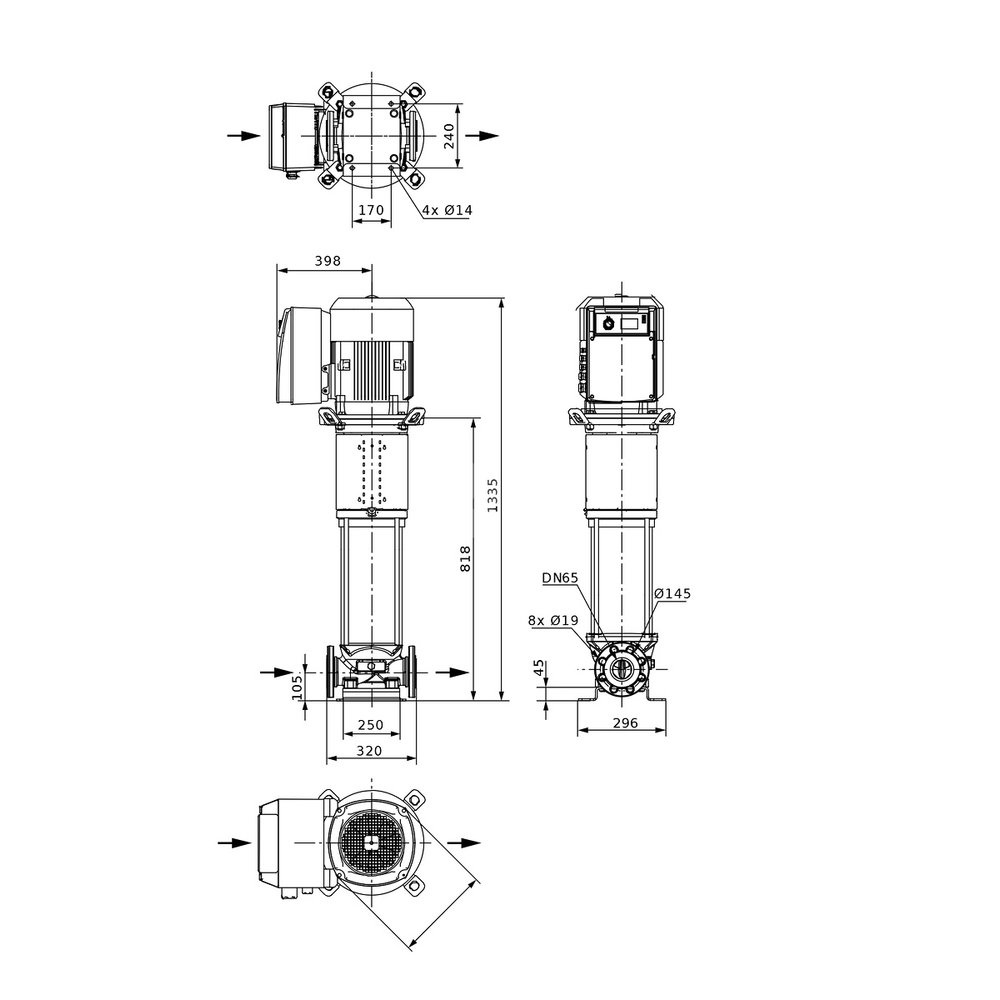 Wysokociśnieniowa, pionowa pompa wirowa o najwyższej sprawności, z króćcami Inline, silnikiem IEC o klasie sprawności IE4 oraz zintegrowaną, chłodzoną powietrzem przetwornicą częstotliwości. Wbudowana przetwornica częstotliwości umożliwia zmienną prędkość obrotową oraz regulację ciśnienia i PID.