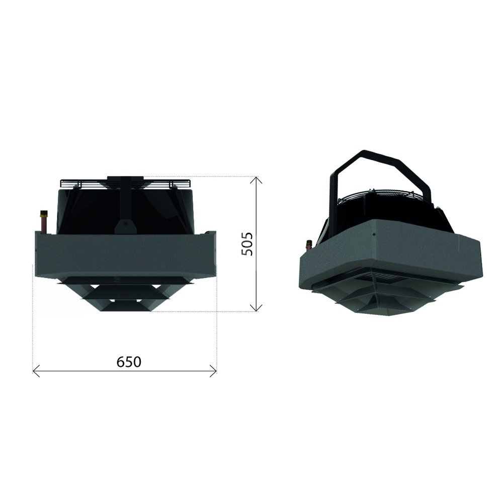 Zastosowanie nawiewnika powoduje równomierne rozprowadzenie nawiewanego powietrza z nagrzewnicy w czterech kierunkach. Zalecany szczególnie do nagrzewnic montowanych podstropowo w niskich pomieszczeniach.