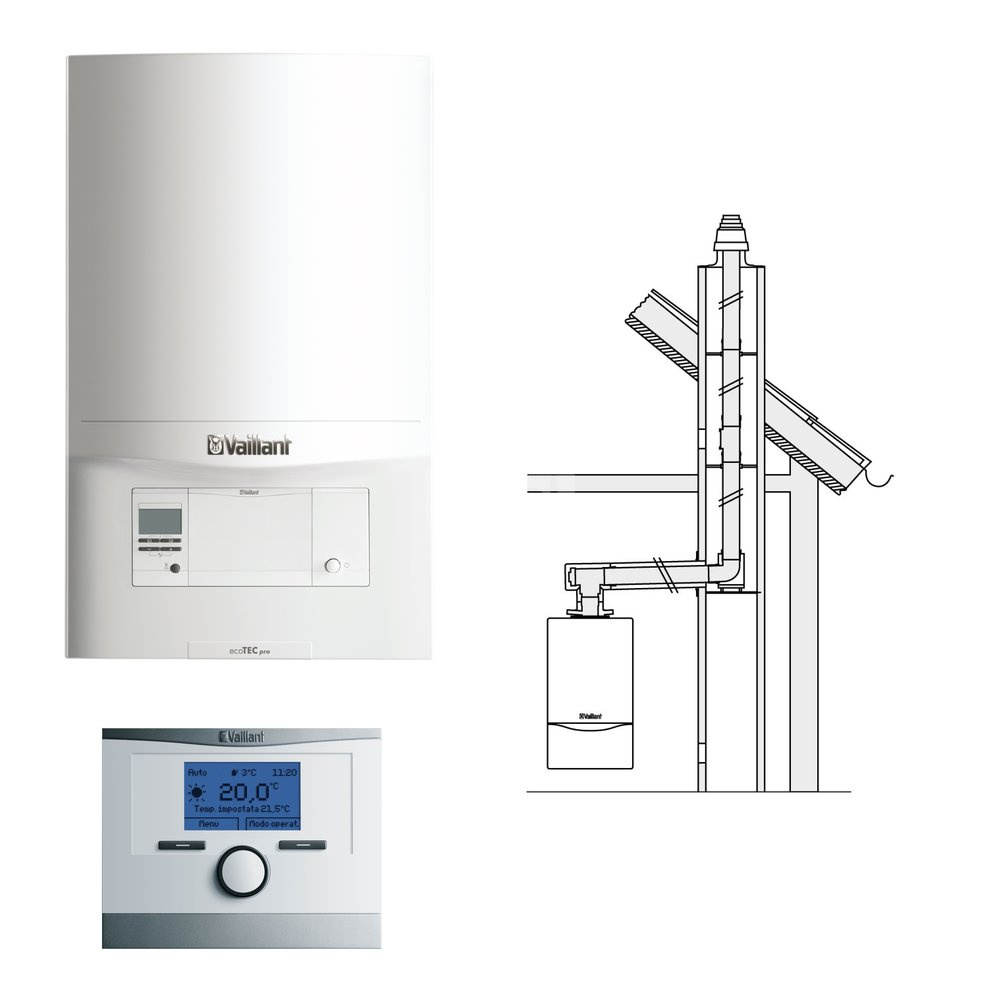 Gazowy, dwufunkcyjny kocioł kondensacyjny Vaillant VCW ecoTEC pro 236/5 z z regulatorem pokojowym calorMATIC 350 lub regulatorem systemowym multiMATIC 700 i opcjonalnie zestawem podstawowym systemu powietrzno-spalinowego szachtowego lub z wyrzutem przez ścianę.