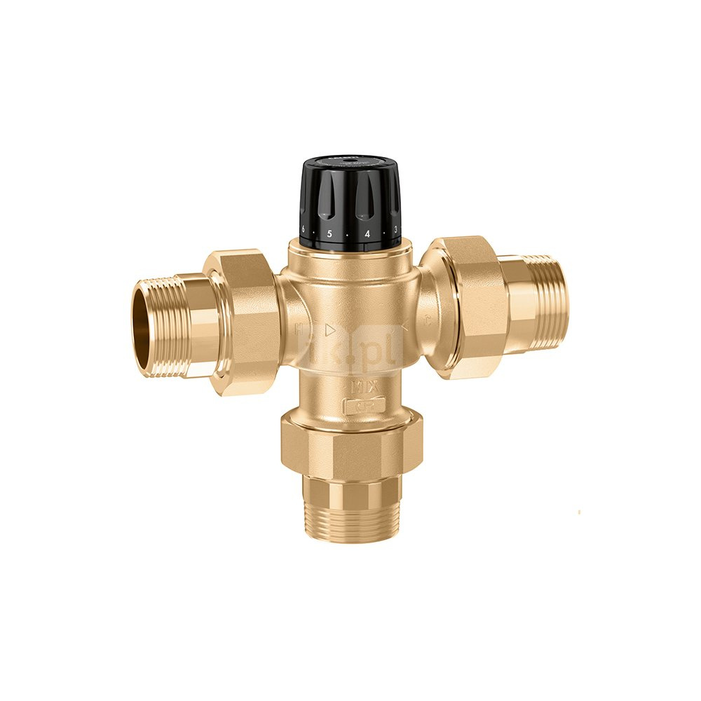 Regulowany termostatyczny zawór mieszający do systemów scentralizowanych. Korpus wykonany ze stopu odpornego na wypłukiwanie cyn