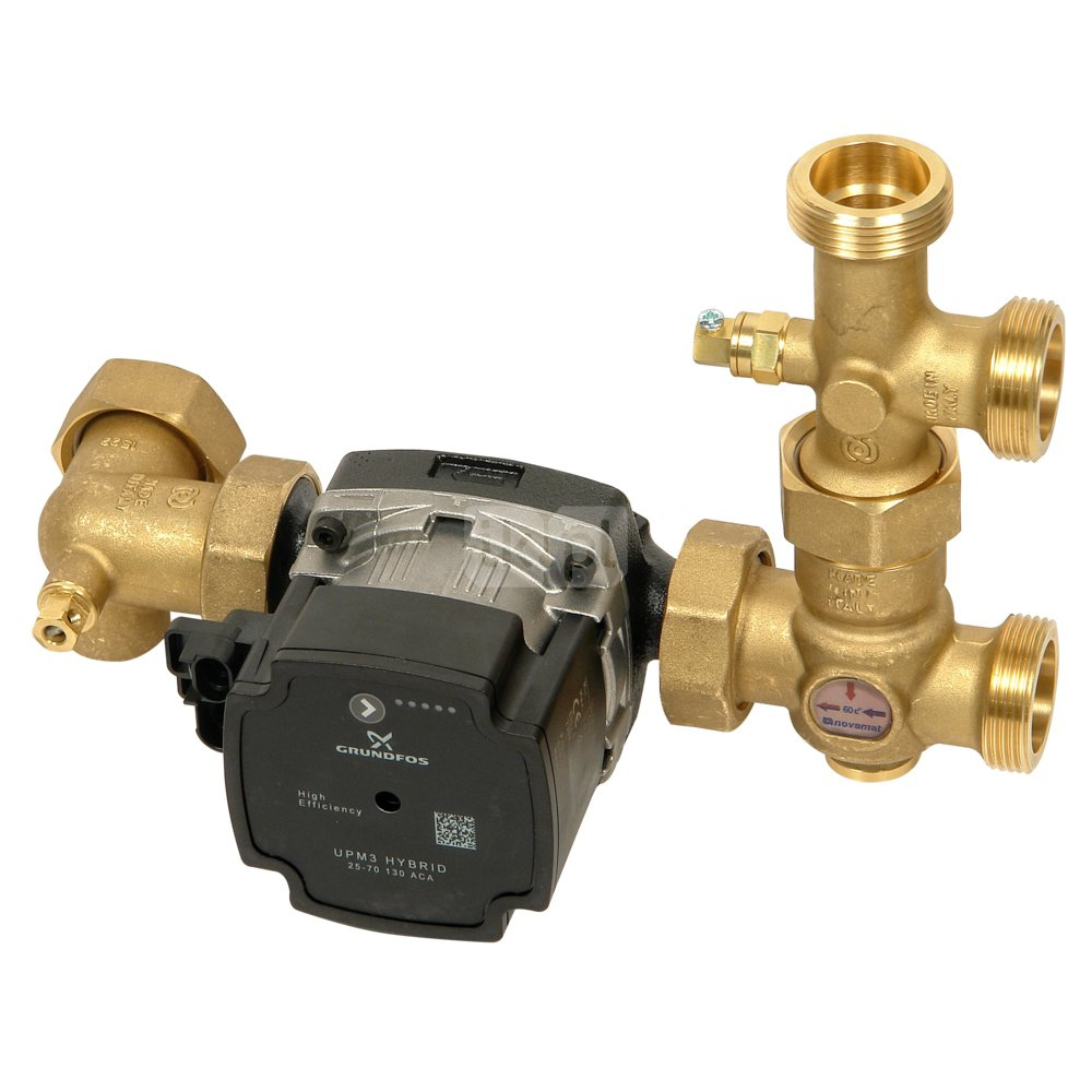 Antykondensacyjna grupa pompowa VITMAT 1,0 T - grupa pompowa do podwyższania temperatury powrotu kotła z zaworem antykondensacyjnym z regulacją termostatyczną (opcje: 50°, 55°, 60°, 65°, 70°C)