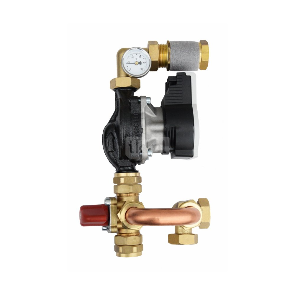 Grupy mieszająco – pompowe M-GPTC - DN 20 oraz M-GPT przeznaczone są do rozdzielaczy ogrzewania podłogowego. Ich zadaniem jest ograniczenie temperatury czynnika wprowadzanego do rozdzielacza. Grupa może być połączona za pomocą nypli ze wszystkimi typami rozdzielaczy o rozstawie 220 mm. Dzięki dołączonym uchwytom możliwe jest również dostosowanie rozdzielacza do potrzebnego rostawu grupy pompowej. Zestaw składa się z termostatycznego zaworu mieszającego o przepływie kvs 3,4 i zakresie regulacji 20-45°C(dla grup M-GPTC) lub obrotowego zaworu mieszającego o przepływie kvs 6,3(dla grup M-GPT) , termometrów wody zasilającej i powrotnej, łączników mosiężnych, uchwytów do rozdzielacza oraz pompy Wilo lub Grundfos.