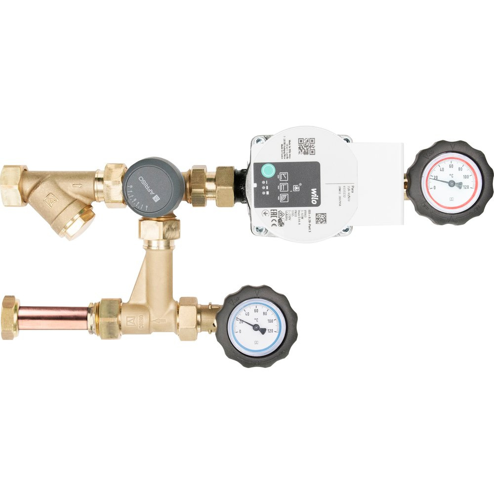• Wyposażona w niezbędną armaturę: filtr siatkowy, zawory odcinające, trójnik z wbudowanym zaworem zwrotnym na powrocie oraz termometry.