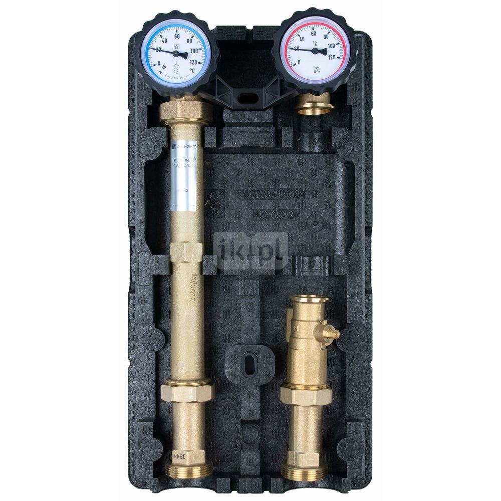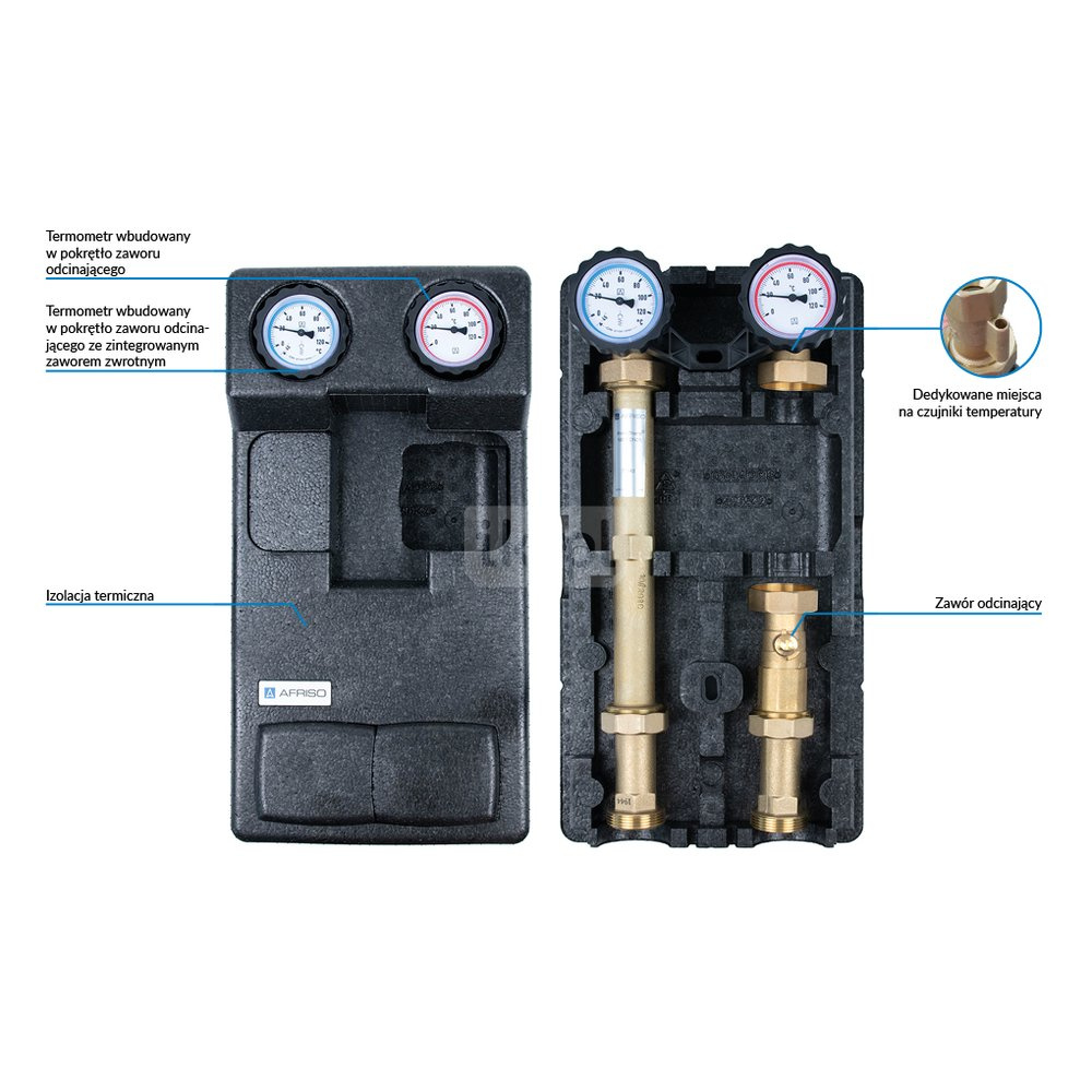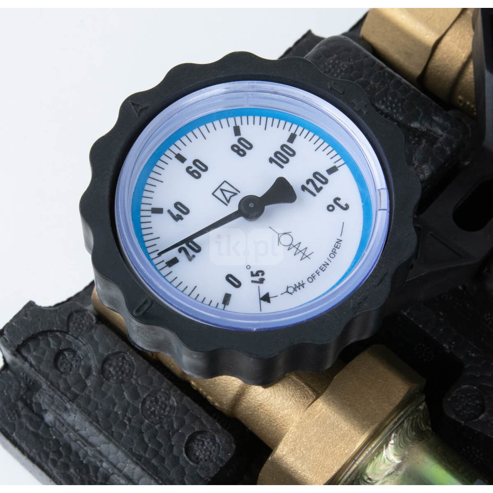 - Wyposażona w niezbędne komponenty: termometry, zawór zwrotny, zawory odcinające na zasilaniu i powrocie, zawór odcinający przed pompą i izolację termiczną.
