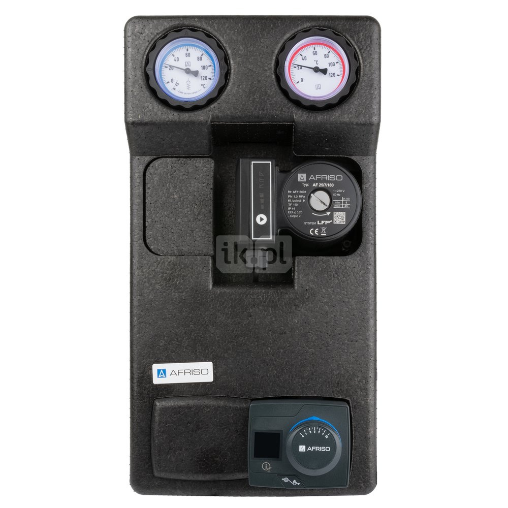 - Wyposażona w niezbędne komponenty: termometry, zawór zwrotny, zawory odcinające na zasilaniu i powrocie, zawór odcinający przed pompą i izolację termiczną.
