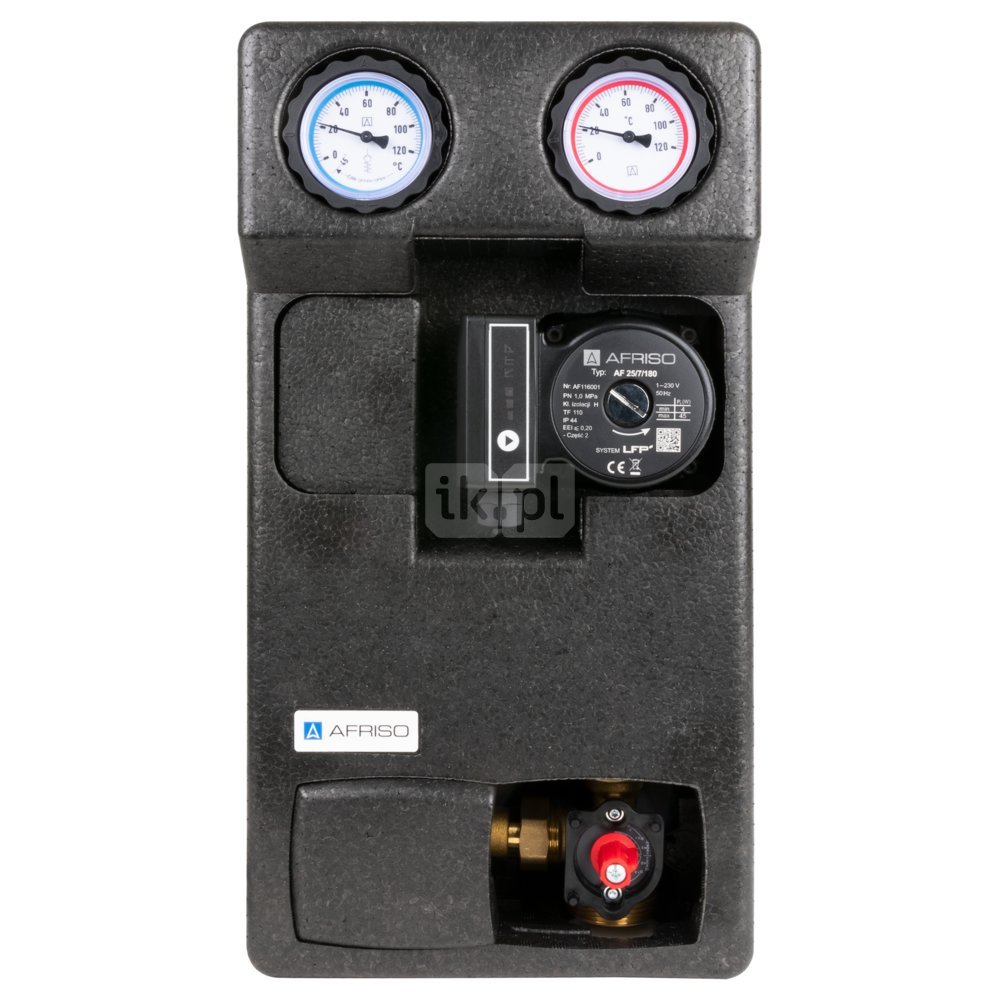 - Wyposażona w niezbędne komponenty: termometry, zawór zwrotny, zawory odcinające na zasilaniu i powrocie, zawór odcinający przed pompą i izolację termiczną.