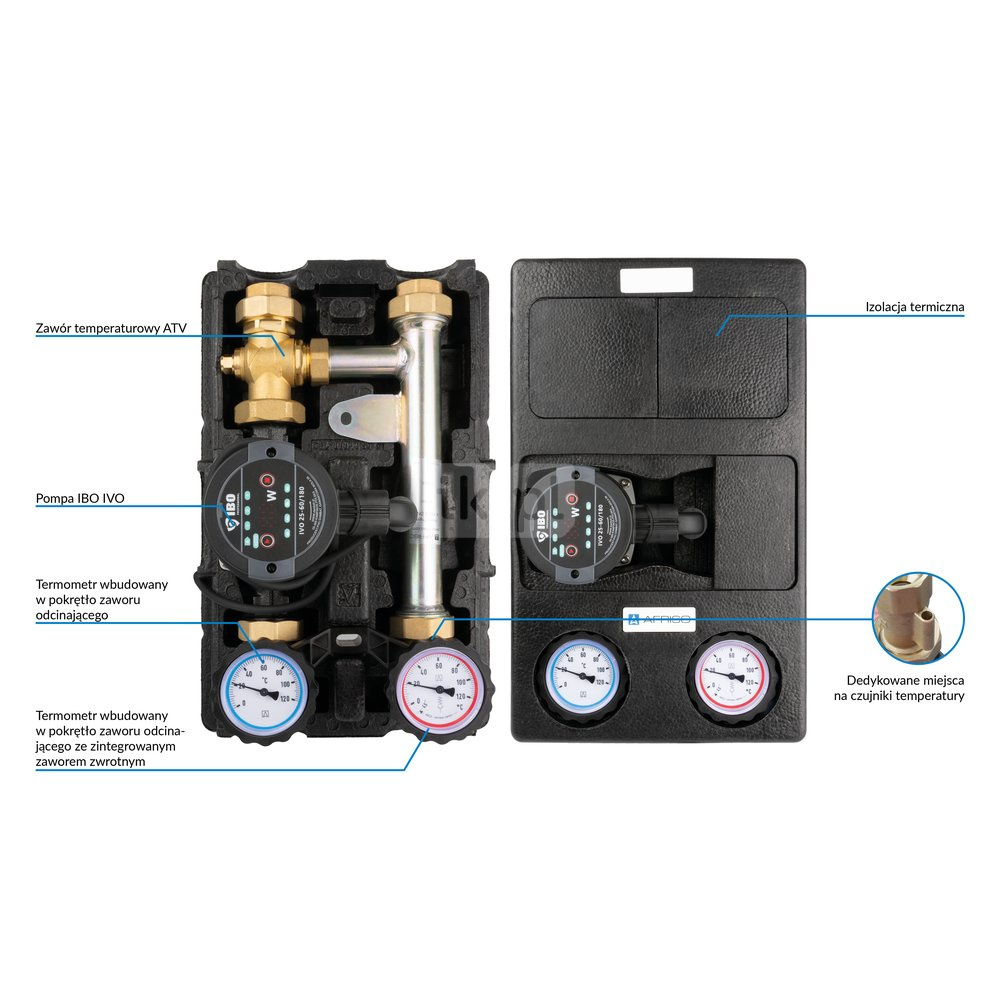 - Zainstalowany zawór mieszający ATV o temperaturze nominalnej 60°C oraz pompa IBO IVO 25-60/180.