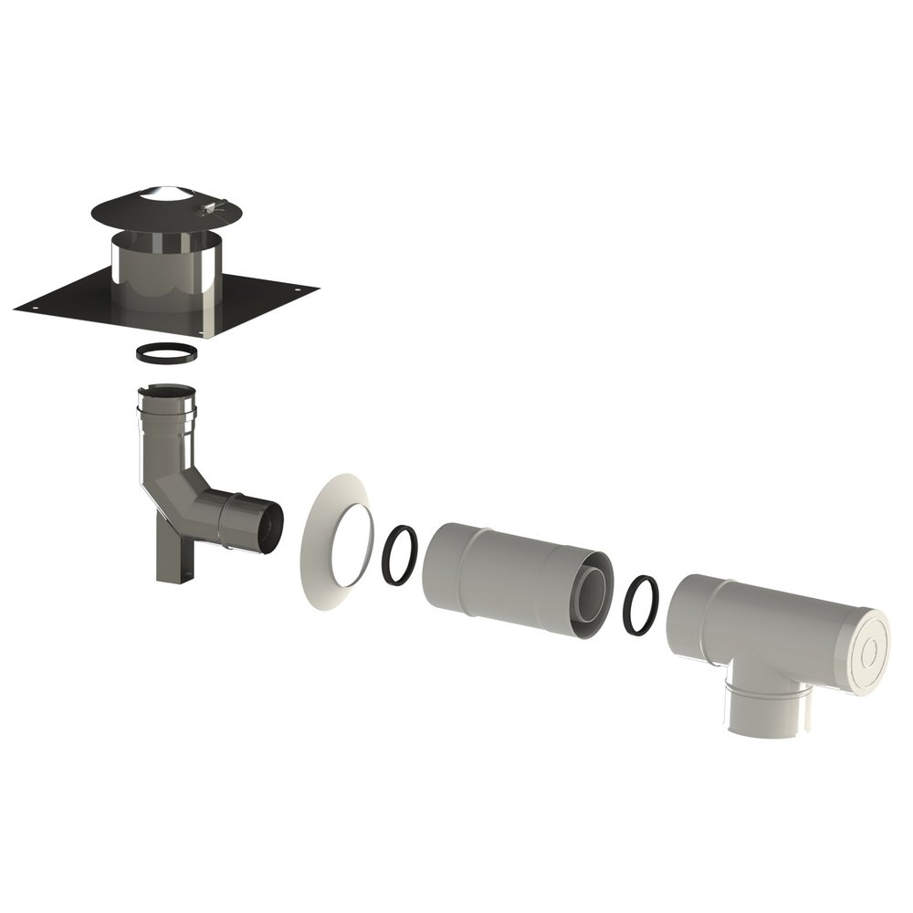Zestaw powietrzno-spalinowy pionowy zbudowany z dwóch współosiowych rur, zewnętrznej obudowy i wewnętrznej rury spalinowej. Wykonany w formie kompletnego terminala spalinowo-powietrznego montowanego ponad połacią dachu. Specjalne wykonanie zakończenia umożliwia wyrzut spalin z części pionowej i jednoczesne czerpanie świeżego powietrza do spalania. Uniwersalne przegubowe przejście zestawu przez dach przeznaczone jest do montażu terminala na dachach o pochyleniu 20°-45°, w sposób gwarantujący szczelność, przy niekorzystnych warunkach atmosferycznych. Zestaw zawiera: przejście przez dach uniwersalne z kołnierzem ołowianym do montażu rury 930 mm, rurę 930 mm z zakończeniem pionowym do montażu z 75F901361, uszczelkę silikonową (wewnętrzną).