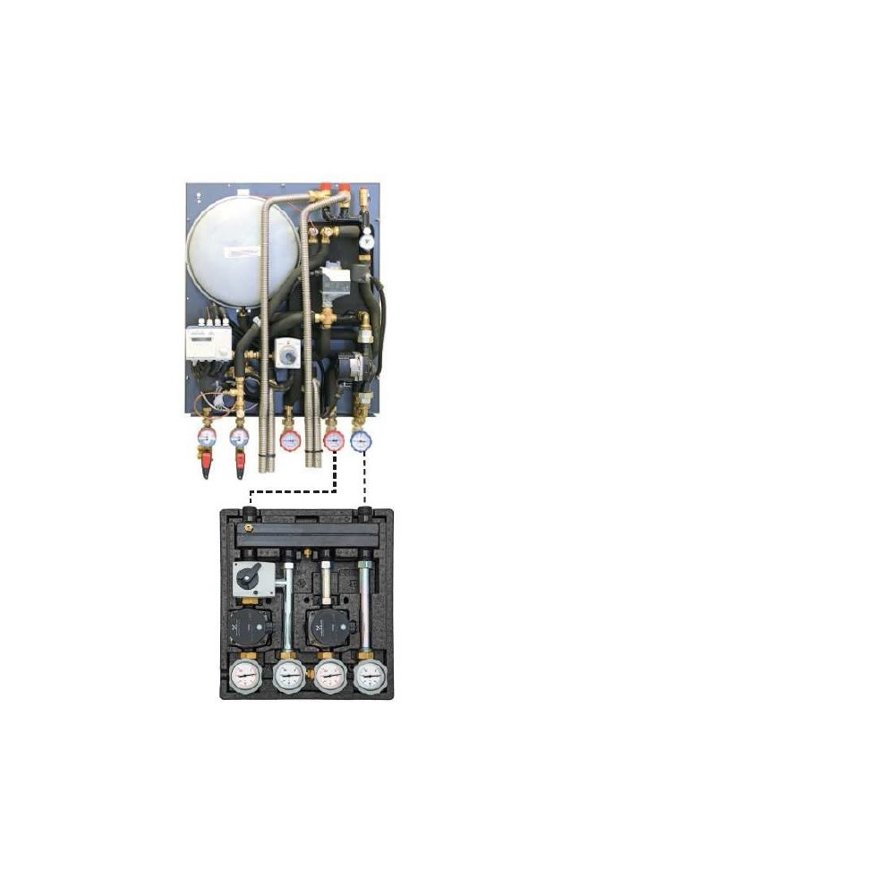 naczynia przeponowego 12 I, manometrów, termometrów, rozdzielacza, obiegu grzewczego bez mieszacza z pompą UPM3 AUTO 15-70, obiegu grzewczego z mieszaczem i pompą UPM3 AUTO 15-70, obudowy, sterownika pogodowego, izolacji. Max. moc dla c.o. 26 kW.