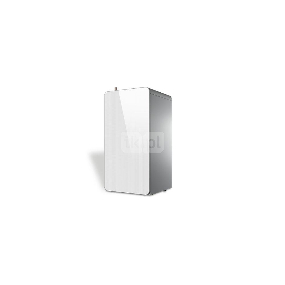 SWDP 300 O C – stojący, o podstawie kwadratowej, ze stali nierdzewnej podgrzewacz do c.w.u. z jedną wężownicą do pomp ciepła, czujnik temp. na wyposażeniu. Biały metalowy front komponuje się z metalową obudową pompy ciepła.