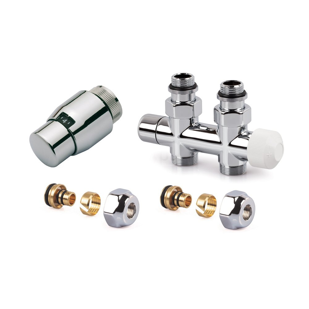 Zestaw CHROM do grzejników dolnozasilanych: głowica Thera-200 (chroma/chrom) T4221, zawór podwójny, prosty, V2882DSL15A + 2x złączka do rur wielowarstwowych FEM24M16X2