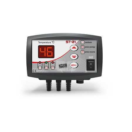 Regulator ST-21 z wyświetlaczem LED przeznaczony jest do sterowania pompą obiegu wody centralnego ogrzewania. Zadaniem regulatora jest załączanie pompy, gdy temperatura uzyska zadaną wartość oraz wyłączanie jej – jeśli kocioł wychłodzi się poniżej zadanej o wartość ustawionej histerezy. Taki tryb pracy zapobiega niepotrzebnemu działaniu pompy, co pozwala zaoszczędzić energię elektryczną jak również przedłuża żywotność pompy i podnosi jej niezawodność. Regulator ST-21 może równiez pełnić funkcję termostatu wyłaczając pompę po osiągnięciu temperatury zadanej. Sterownik posiada również funkcjęANTYSTOP, która zapobiega zastaniu pompy obiegowej poza sezonem (pompa załącza sie co ok. 10 dni na 1 minutę). Dodatkowym zabezpieczeniem jest funkcja antyzamarzanie, która przeciwdziała zamarzaniu wody w instalacji, gdy temperatura spadnie poniżej 6°C pompa załączy się na stałe).